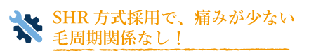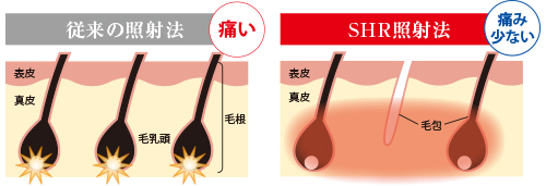 SHR方式は、柔らかな光エネルギーを毛包に蓄積させる脱毛方法。ピンポイントで強いエネルギーを照射する従来の脱毛とは異なり、施術部位がぽかぽかと温かく感じる程度の弱いエネルギーでも、十分な脱毛結果が期待できます。また、毛周期に関係なく来店スケジュールが組めるため、より早い脱毛卒業を実現しました。